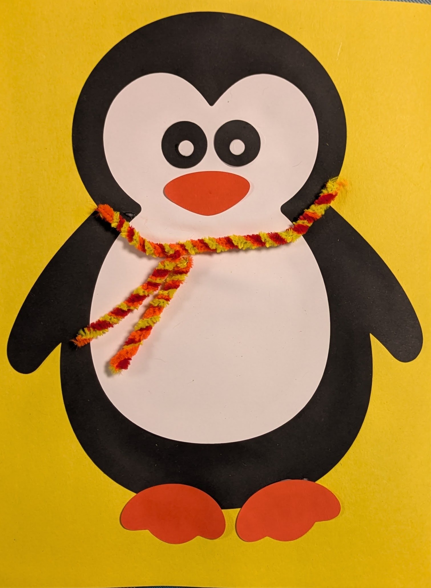 Cut out the shapes of the penguin and glue together. Then twist the pipecleaners together to make a scarf.