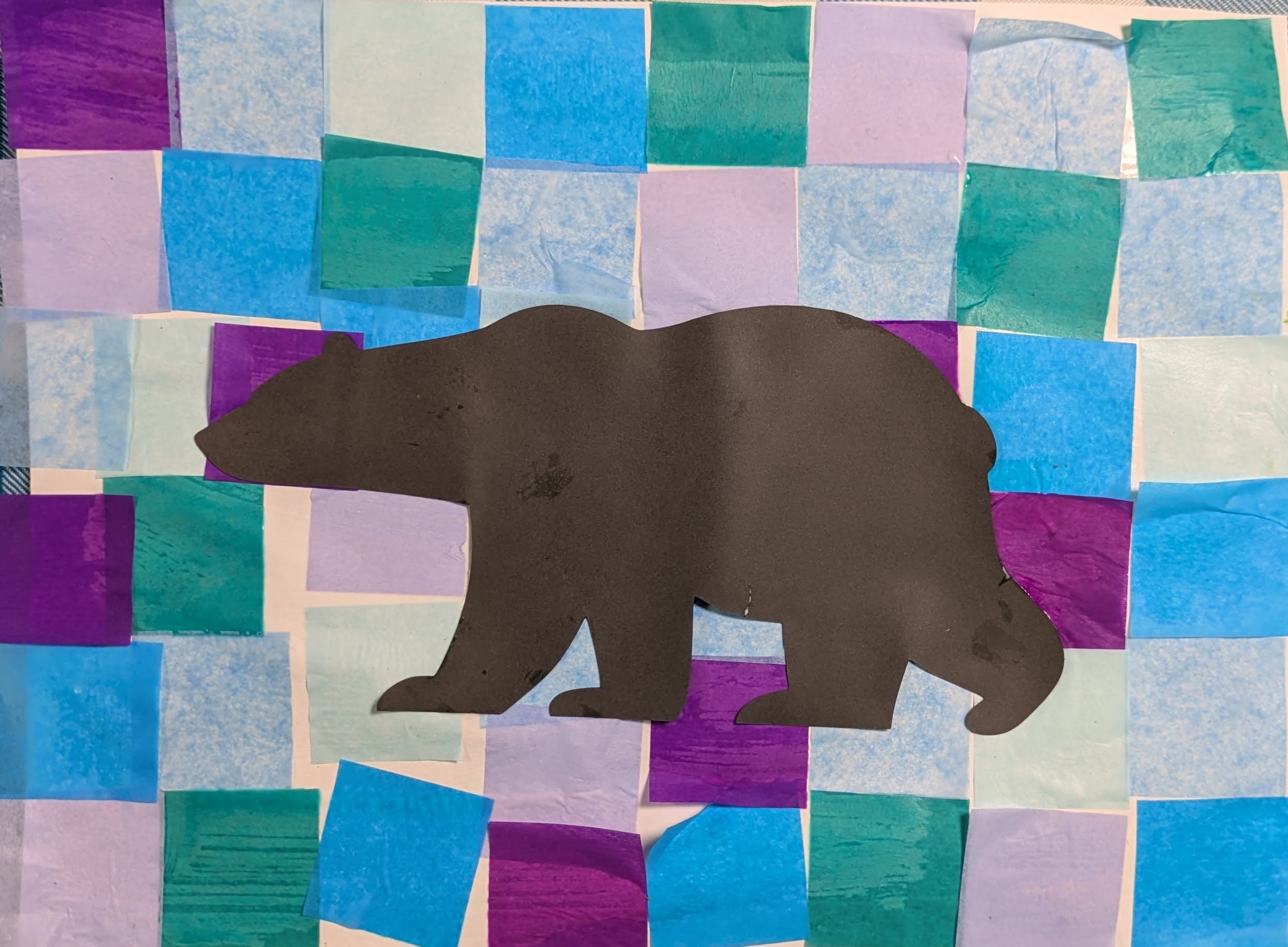 Cut out a polar bear on the black cardstock. Glue blue and purple tissue paper squares all over the paper to make a colorful northern lights background for your polar bear.