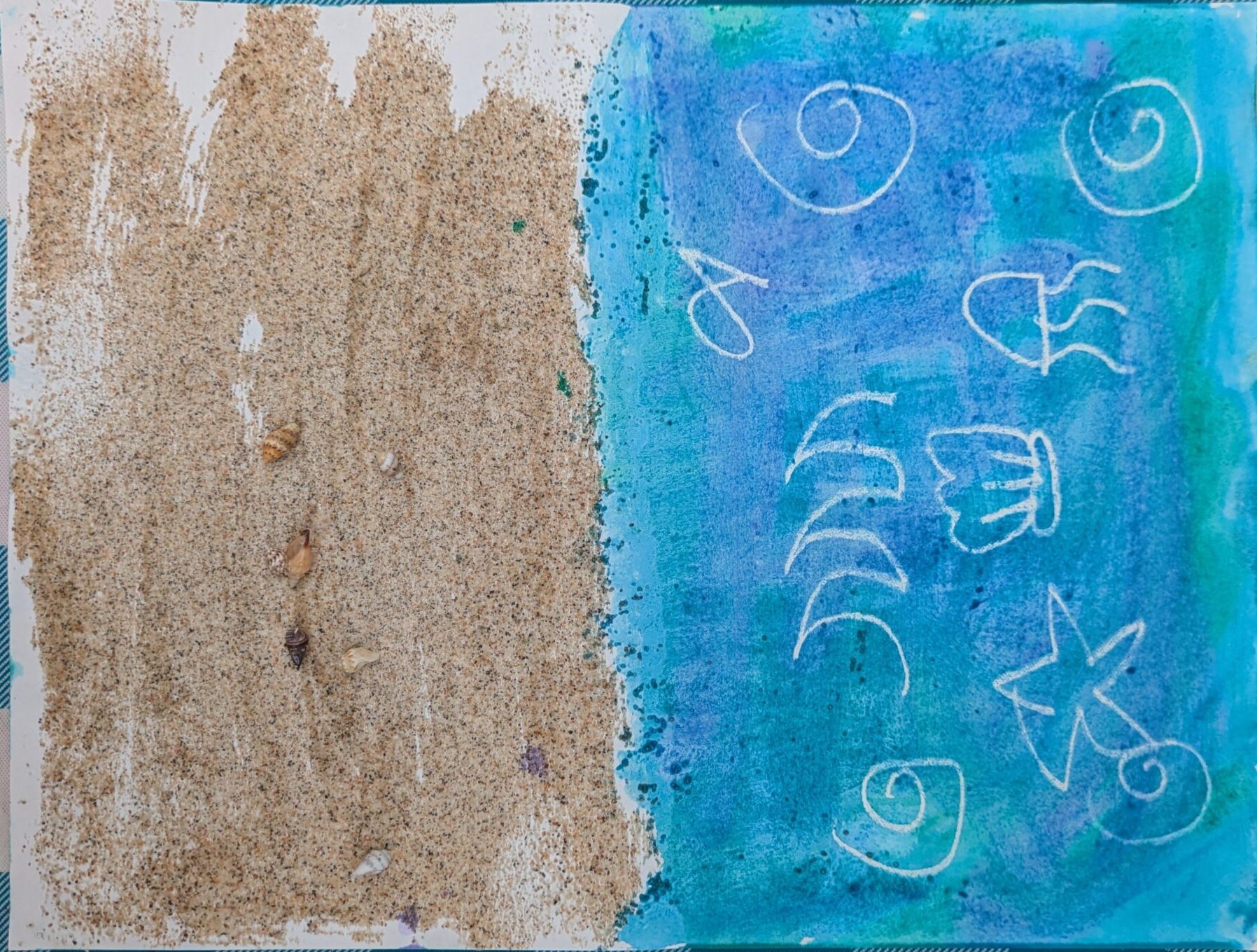 Make a beach on one side of your paper. Draw with a white crayon on the other side then cover with watercolor paint.