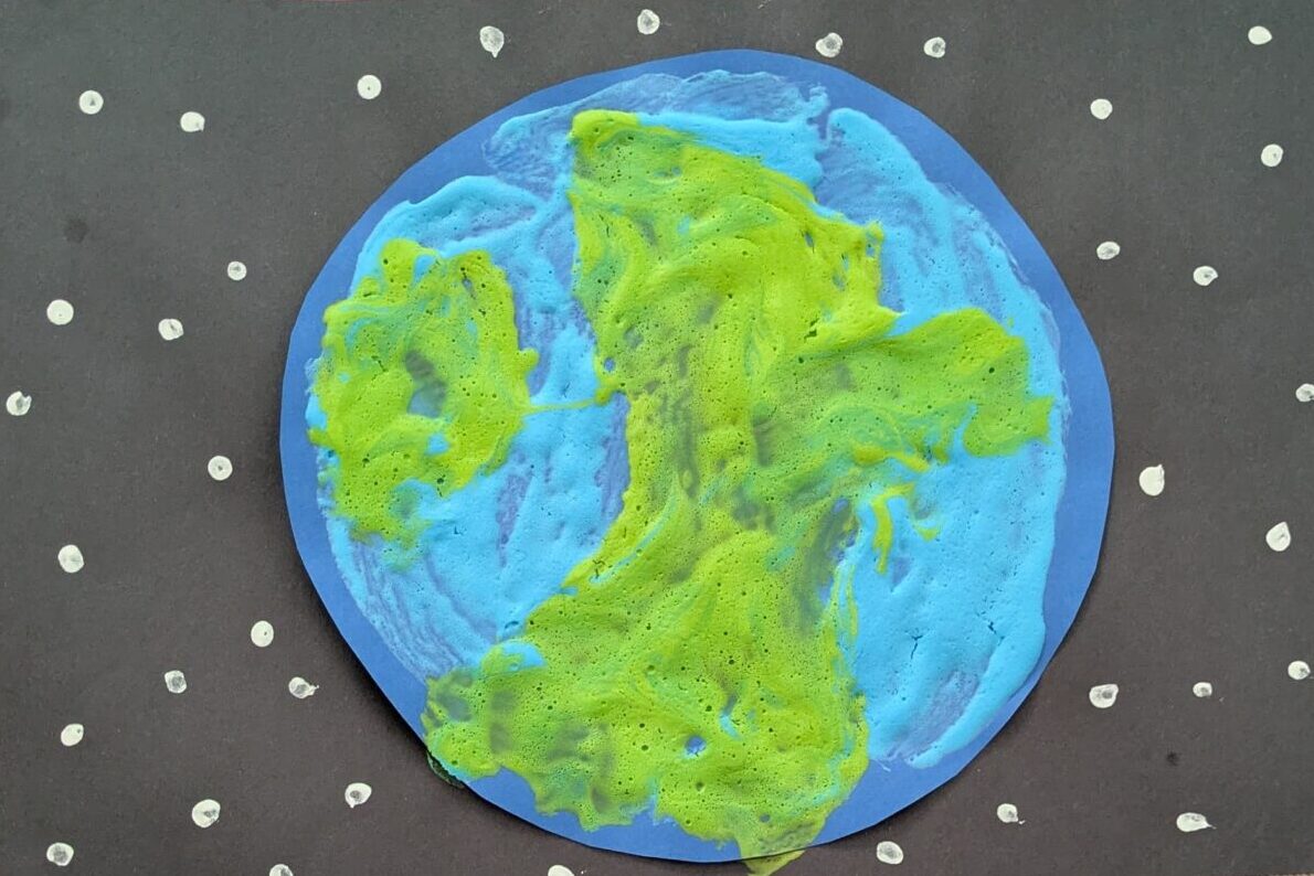 Mix together shaving cream, paint, and glue to make your own puffy paint. Cut out a circle and glue it onto black paper and fill your circle with puffy paint to make your 3D earth. Use a q-tip to make stars around your planet.